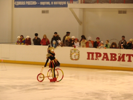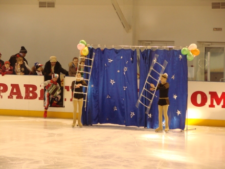 Полные трибуны зрителей с цветами в ожидании. Открывается занавес - и на льду появляется конферансье (Ангелина Гафнер) и объявляет «цирковые» номера.