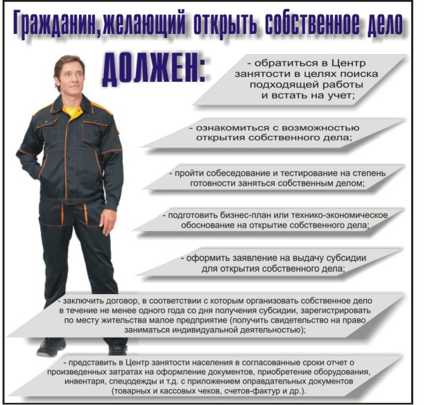 - Субсидия предоставляется безработному гражданину, желающему начать собственное дело, при наличии у него: заявления на предоставление субсидии; технико-экономического обоснования проекта (бизнес-плана); положительного экспертного заключения по технико-экономическому обоснованию проекта; договора между Центром занятости и безработным гражданином о содействии предпринимательству и самозанятости; свидетельства о государственной регистрации юридического лица, индивидуального предпринимателя или крестьянского (фермерского) хозяйства; свидетельства о постановке на учет в налоговом органе юридического лица (индивидуального предпринимателя); рекомендации службы занятости.
