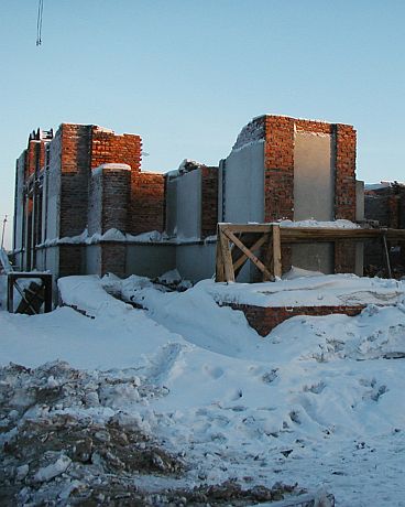 Спустя год, 30 мая 2003 года, газета пишет: "Все выше и выше поднимаются стены храма Новомучеников и Исповедников российских… Выполнено чуть больше 40% работ по кирпичной кладке. Началась серьезная работа по монолитному участку, идет укладка бетона в основание будущей звонницы…. Новая бригада из пяти человек, присланная из Омска, приступает к штукатурке фасада.