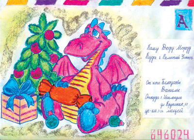 В средней подгруппе было больше всего участников, и бесспорным победителем, по мнению жюри, стал Данила Белоусов, ученик 3А класса лицея, выполнивший на конкурс два конверта: один в традиционной технике – бумажный конверт с изображением очень симпатичного символа грядущего года – Дракона, а второй конверт Данила выполнил… на фанерной доске с помощью прибора для выжигания, здесь героями юного мастера стали Маша и Медведь и Дед Мороз, читающий письмо. Словом, Данила нас порадовал и удивил! Работы участников конкурса были выполнены в разных техниках, так в номинации «За лучшую аппликацию» мы награждаем Альбину Рековскую,ученицу 3А класса СОШ № 1, а в номинации «Лучший рисунок» победу разделили Татьяна Емельяненко, ученица 2В класса СОШ № 1, и Мария Золотарева, 1Б, лицей.