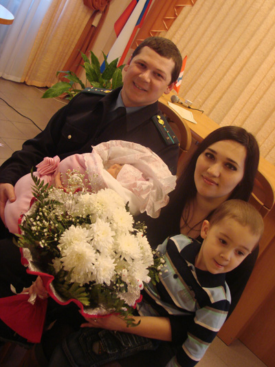 «Мы женаты уже пятый год, - рассказывает глава семьи Залим Хажнагоев, - по долгу службы 1,5 года назад приехали в Исилькуль. Город небольшой, но очень нравится, здесь люди очень добрые, отзывчивые, хотелось бы, чтобы Исилькуль процветал. С этим городом у нас только хорошие ассоциации. Здесь родилась наша малышка. И после ее появления на свет в нашей семье происходят только радостные события. Нам дали 3-комнатную квартиру в новом доме в пограничном городке, моя мама стала лауреатом конкурса «Учитель года в России», заняла 3 место. Нас пригласили на торжественную регистрацию в этот красивый дворец, потому что Лаура родилась 100-м по счету ребенком, и все у нее будет на 100%».
