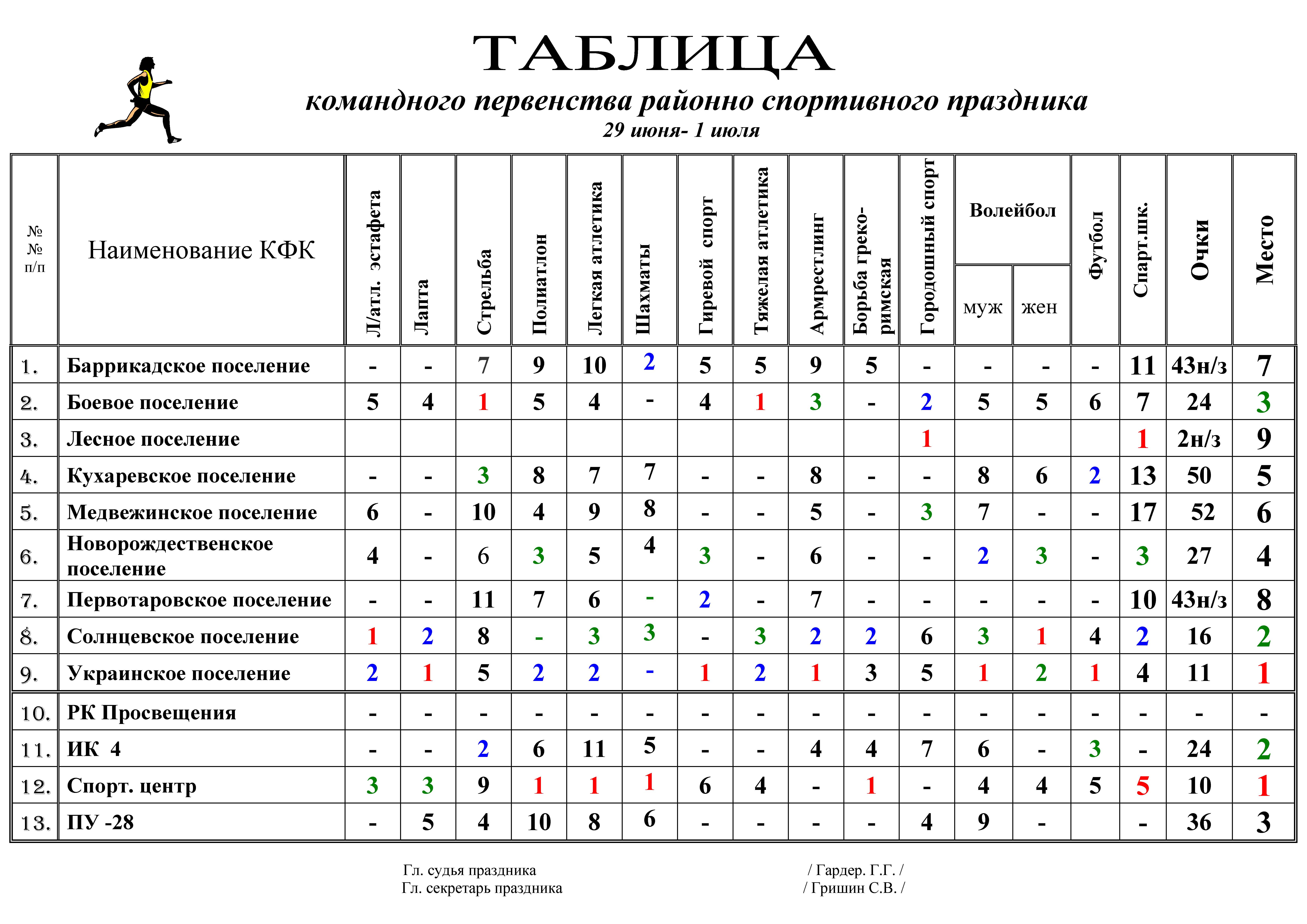 За два дня соревнований по ПОЛИАТЛОНУ спортсмены выступили в 5 видах программы: стрельбе, гимнастике, спринте, кроссе и метании гранаты. В итоге у мужчин первенствовали Б. Оспанов (Медвежинское СП), С. Егоров (Кухаревское СП), Б. Назаров (Новорождественское СП), у женщин - Н. Борисова, выступавшая лично. Места в командном зачете распределились так: I – Спортцентр, II – Украинское СП, III – Новорождественское СП.