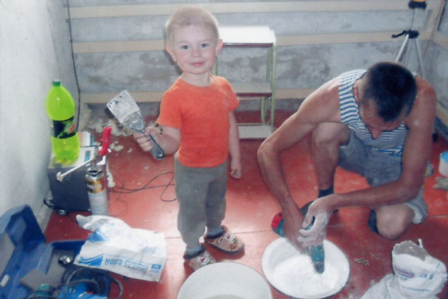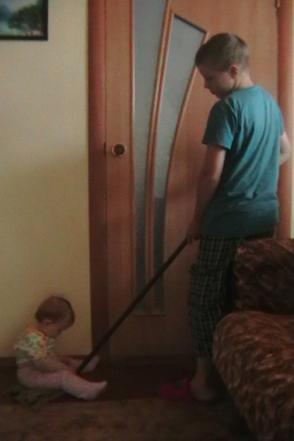 Мой племянник Сергей очень добрый мальчик, хороший помощник и очень любит свою младшую сестренку – мою доченьку Евочку. На момент съемки Еве было 6 месяцев, а Сереже 10 лет. Как обычно, я пошла на улицу по хозяйственным делам, а Сережу попросила протереть полы и присмотреть за Евочкой. По словам Сережи, Ева не хотела играть, просилась к нему на руки, и ему ничего не оставалось делать, как совместить два в одном: он посадил Еву на мокрую швабру и вместе с ней мыл пол. Когда я это увидела, я очень рассердилась. Но, заметив восторженный взгляд Евочки, просто рассмеялась и попросила их не шевелиться, чтобы запечатлеть на память этот момент.