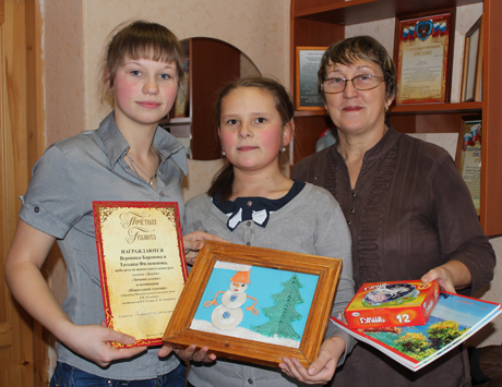 Замечательный новогодний сувенир своими руками изготовили победительницы конкурса «Зимняя сказка» Татьяна Филимонова и Вероника Баранова. На фото девочки с воспитателем Исилькульского детского дома В.Р. Гусевой. |
