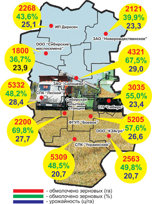 По данным районного Управления сельского хозяйства, на 1 октября зерновые культуры были убраны на 46880 га, что составляет 51,8 % занятой ими площади. При средней урожайности 22,3 ц/га хозяйствами всех форм собственности намолочено 60,7 тыс. тонн пшеницы, 35,8 тыс. тонн ячменя, 3,5 тыс. тонн овса, 4,6 тыс. тонн гороха. Ближе всех к окончанию уборки Сибирская опытная станция и ЗАО «Солнцево».
