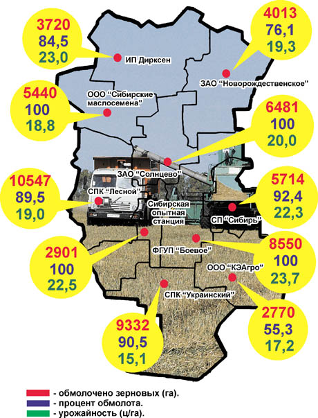 По данным райкома профсоюза работников АПК, на начало текущей недели наибольший намолот зерна на комбайне «Нью-Холланд» получил комбайнер СП «Сибирь» АПК «Титан» Сергей Иванович Смирнов – 2885 тонн (в пересчете на условные тонны – 1866,8), обогнав своего товарища Владимира Анатольевича Ткачева (1644,8 условных тонн).